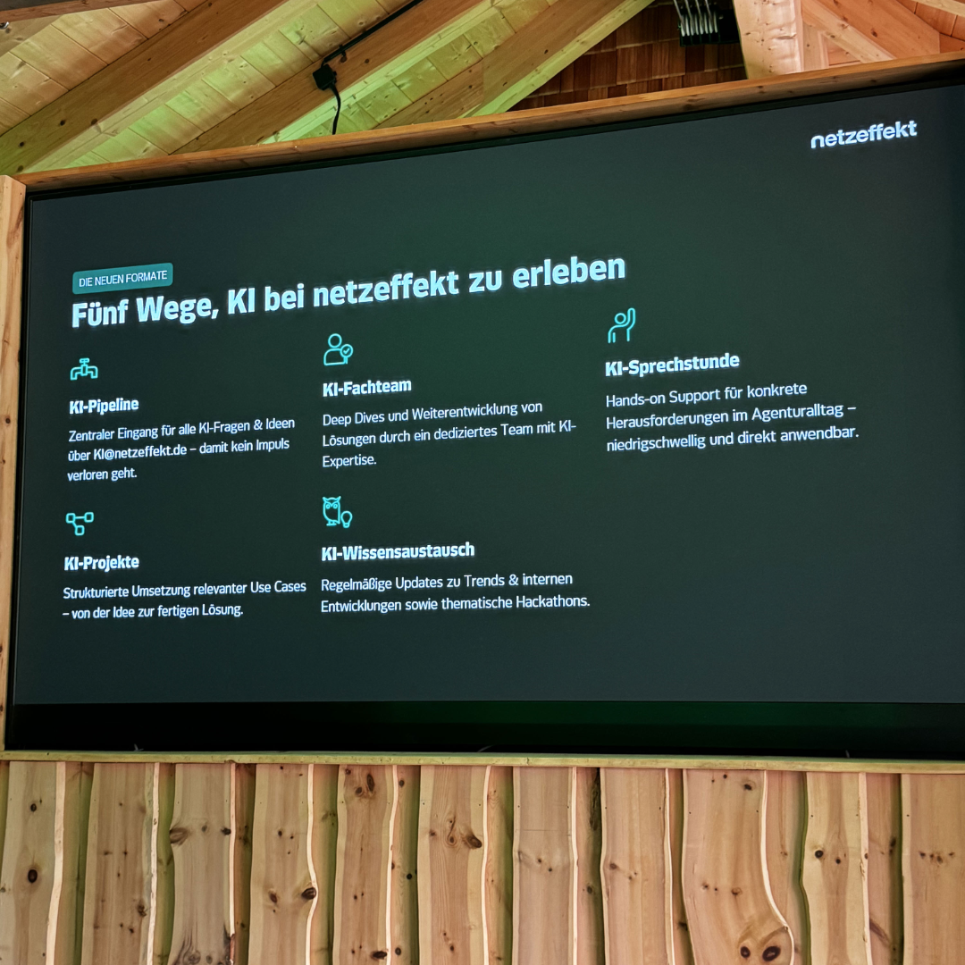 Dabei richten wir uns bei netzeffekt an einer klaren Vision aus: Mehr Impulse, mehr Effizienz und mehr Qualität. Unser Vorteil: Bereits 2023 haben wir die erste fachliche Basis gelegt. Seither trifft sich der Arbeitskreis KI-Union mit dem Ziel, nah an Trends zu sein, Neues auszuprobieren und das Thema allgemein in der Firma zu kommunizieren. Wir können die neue Thematik daher aus einer Position der Stärke angehen. Panik? Brauchen wir nicht.